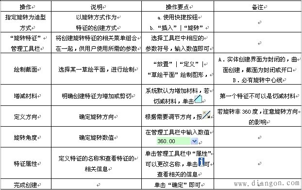 | 旋转特征是具有回转中心,而且通过轴线的剖面关于轴线严格对称的特征。常用于构造回转体零件,旋转体零件的创建和拉伸特征相似,旋转特征的特征参数及操作要点见表1。 |