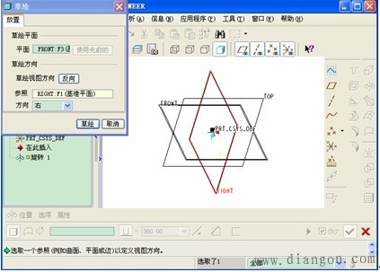 | (3)弹出“草绘”对话框,移动鼠标至绘图区,选择草绘平面FRONT,接受系统默认的参照,点击“草绘”,如图4。 |
