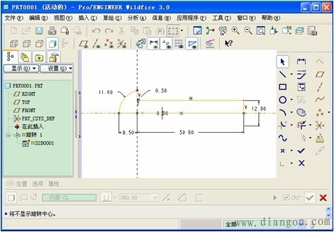 注意:⑴.草绘旋转特征截面时,其截面必须全部位于旋转中心一侧,并且截面必须是封闭的,如果打开目的管理器,系统会自动标注截面尺寸,但此时的尺寸标注及不合理,需要使用标注命令自行标注,封闭环遵循“实―空―实”。 ⑵.旋转特征必须有一条绕其旋转的中心线。 ⑶.若草绘中使用的中心线多于一条,该软件将自动选中草绘的第一条中心线作为旋转轴,除非用户另外选取,其中心线必须位于用户选取或创建的平面内。 ⑷.实体特征的截面必须是封闭环的,而曲面的特征截面可以是开口环的。 说明:利用“旋转”,完成“曲面”、“薄壁”和“切减材料”与“拉伸”类似。 |