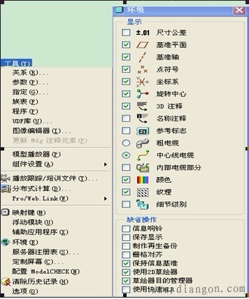 3.单击“工具”|“环境”,弹出环境对话框,勾选显示的项目进行控制,如图2