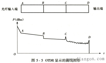 图中的主时钟产生标准时钟信号;脉冲发生器根据这个时钟产生符合要求的窄脉冲,并用它来调制光源;光方向耦合器将光源发出的光,耦合到被测光纤,同时将散射和反射信号耦合进光电检测器,再经放大及信号处理后送人示波器显示输出波形及在数据输出系统输出有关数据。其中要进行信号处理的原因是,后向散射光非常微弱,淹没在一片噪声中,因此,要用取样积分器,在一定时间间隔内,对微弱的散射光波取样并求和。在这个过程中,由于噪声是随机的,在求和时抵消掉了,从而将散射信号取出。 一条有代表性的测量曲线如图5-5所示.下面以它为例,说明光纤中可能出现的衰减情况。 |
