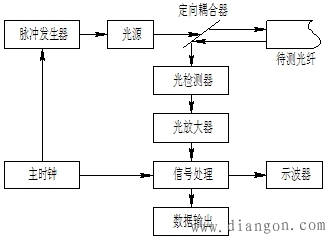 由式(5-9)可知道,只要能测出z1,z2点散射光返回的光功率以及z1,z2间的距离,就可算出平均衰减系数α(z1,z2).通常依据这种原理进行的损耗测量是由光时域反射计来完成. ②光时域反射计原理方框图 光时域反射计简写为OTDR,它的原理方框图如图5-4所示. |