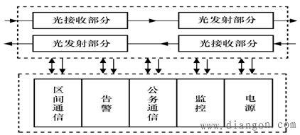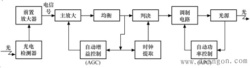 1.光中继器 光脉冲信号从光发射机输出经光纤传输若干距离以后,由于光纤损耗和色散的影响,将使光脉冲信号的幅度受到衰减,波形出现失真,这样,就限制了光脉冲信号在光纤中做长距离的传输.为此就需在光波信号经过一定距离传输之后.要加一个光中继器,以放大衰减的信号,恢复失真的波形,使光脉冲得到再生. (1)中继器的构成方框图 根据光中继器的上述作用,一个功能最简单的中继器,应是由一个设有码型变换的光接收机和设有均放和码型变换的光发射机相接而成,如图2所示. 显然,一个幅度受到衰减、波形发生畸变的信号,经过中继器的放大、再生之后就可恢复为原来的情况. 但是作为一个实用的光中继器,为了维护的需要,还应具有公务通信、监控、告警的功能,有的中继器(机)还有区间通信的功能.另外,实际使用的中继器应有两套收、发设备,一套是输出,一套是输入,故实际的中继器方框图应如图3所示. |