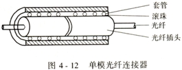 目前常用的光纤连接器是以端面直接耦合为基础的端面对接连接器.如:单模光纤连接器即属于这一种。 单模光纤连接器的结构如图4-12所示.在套管与插头之间置有小球轴承,能够比较精确地校准两插头成一直线,这种连接器的连接损耗为0.46 dB. |