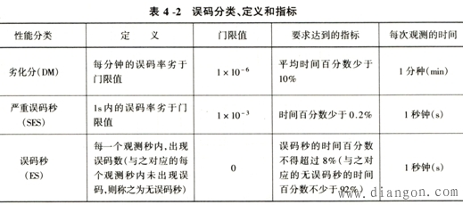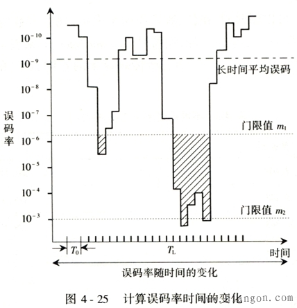 2.误码性能的评定方法 误码性能的评定方法可从以下两个方面来考虑, 一方面是,光纤数字通信系统传输的信息种类可以是电话,亦可为数据等,传输电话时,根据人和语言的特点,并非一定要用每秒误码这种标准来衡量,仅需用每分钟误码的数量级来描述即可,但是,对传输数据来讲,最关心的是在传输数据码组这个时刻有无误码产生. 另一方面,误码发生的特点,不仅是随机地、单个地出现,而且还有突发地、成群地出现. 在考虑了这种因素之后,ITU-T建议在27 500 km假设参考连接情况下,误码率指标如表4-2所示.仅从这个表上不容易看明白,读者可根据这个表以及该表的说明并结合图4-25来理解,表中列出的时间百分数的含义是: 为了有效地衡量和细致地描述误码率随时间的变化情况,人们在一段较长的时间 TL 内观察误码的情况.这TL时间并无特别的规定,可以从几天到一个月时间,然后在To时间内(l min或Is)记录产生误码的个数并算出误码率.最后,计算在TL时间内,To间隔误码超过某一门限值m的时间占总时间的百分数.即将图4-25中超过某门限值rn的To积累时间(即斜线部分所占时间)与TL相比。 |