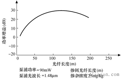 图7-6表示了掺铒光纤放大器的功率增益与光纤长度之间的关系曲线。可以看出,开始是功率增益随掺铒光纤的长度的增加而上升,当光纤长度达到一定值后,增益反而逐渐下降。
