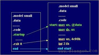 MASM6.0 还增加了定义程序入口点和出口点的伪操作。用 .STARTUP 定义程序的初始入口点,并产生设置 DS,SS 和 SP 的代码。如果程序采用了 .startup 伪指令就不需要再用“ end 标号”指明开始执行点,但还要有 end 伪指令