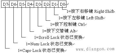 其中的高4位是Ins、Caps Lock、Num Lock、Scroll Lock锁定功能键的动态(临时)标志位,即这些键按下时该位置1,键释放即被置0。这4位动态标志位用于对这些键本身进行处理,而KB FLAG中的这4位静态标志位反映了它们的锁定状态,用于控制其它键的键意确认。KB FLAG1中的D3位为Hold State保持状态位,Ctrl+Num键按下时该位置1;非Num键的任一键按下就使其复位。暂停过程就是将该位置1后进入一个无限循环过程,判断该位是否变为“0”,一但为“0”,即退出循环。