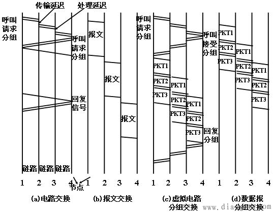 (a)电路交换:先建立到终点间的连接,连接建立后,则无需路由选择,故无显著的延迟等待时间。