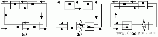 每个方拒代表一个双连接站DAS;小黑方点代表MAC实体逻辑连接,一个双连接站可以有1个或2个MAC实体;只能接入到一个方向的环路之中的站点称作单连接站SAS,对于单连接站,一旦环路出现故障,该站就可能与网络分离开。