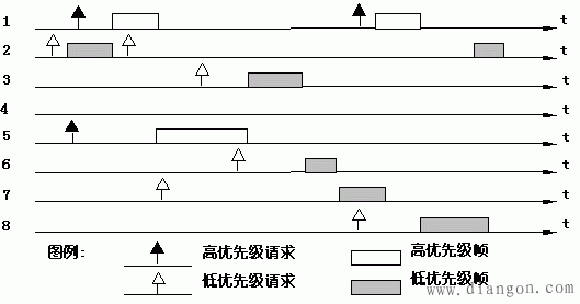 用图说明需求优先协议的工作原理:假设网络中共有8个节点,分别与集线器的8个端口连接。