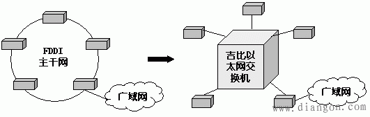 吉比以太网交换机可以很容易将FDDI主干网进行升级:只要将原FDDI的集中器和以太网到FDDI的路由器与吉比以太网交换机相连即可。