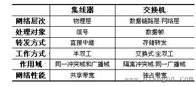 (1)集线器集线器,即HUB,顾名思义就是将线路连接起来,可以简单的理解为将一些机器直接通过线路连接起来组成一个局域网,用电子器件来模拟实际电缆线的工作,使星型以太网仍像传统的总线以太网一样工作。 集线器是中继器的一种形式,中继器(Repeater)的作用是延长网络距离,起到信号的放大和中转的作用。 (2)网桥从工作方式来看,集线器是一种广播模式,所有端口都在同一个冲突域中,也就是说集线器的某个端口工作的时候其他所有端口都有收听到信息,当网络较大的时候网络性能会受到很大的影响。 网桥,即Bridge,就能根据目的地址查询转发表,进行选择性转发,从而过滤通信量。网桥也称桥接器,工作在数据链路层,主要用于在局域网LAN之间进行存储转发数据帧,它可以进行不同LAN之间的帧格式转换,使不同类型的LAN能够顺利通信。另外,由于网桥是使用存储转发机制,所以可以调衡不同LAN之间的传输速度。因此,网桥可互连不同物理层、不同 MAC 子层和不同带宽(如10 mbps 和 100 mbps 以太网)的局域网。 (3)交换机数据链路层的另一种互连设备叫做交换机,即switch,又叫做交换式集线器或多端口网桥。与集线器共享带宽的半双工方式不同,交换机通常都全双工方式,通信的双方独占带宽。对于普通 10 mbps 的共享式以太网,若共有 N 个用户,则每个用户占有的平均带宽只有总带宽(10 mbps)的 N 分之一。使用以太网交换机时,虽然在每个端口到主机的带宽还是 10 mbps,但由于一个用户在通信时是独占而不是和其他网络用户共享传输媒体的带宽,因此对于拥有 N 对端口的交换机的总容量为 N′10 mbps。这正是交换机的最大优点 |