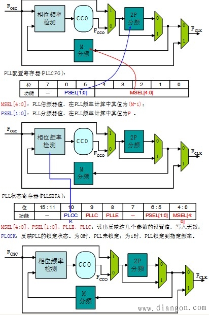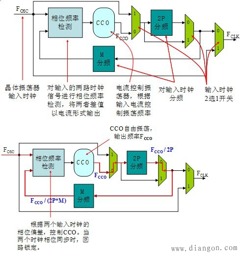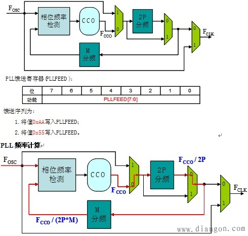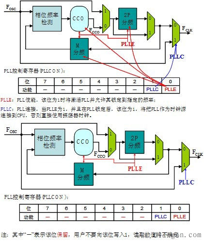 锁相环(PLL) 由晶体振荡器输出的时钟信号,通过PLL升频,可以获得更高的系统时钟(CCLK)。 PLL接受的输入时钟频率范围为10~25MHz,通过一个电流控制振荡器(CCO)倍增到10~60MHz。