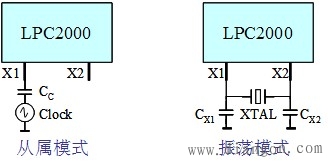 晶体振荡器 LPC2000微控制器可以使用内部的晶体振荡器产生时钟信号,也可以从外部引入时钟信号。