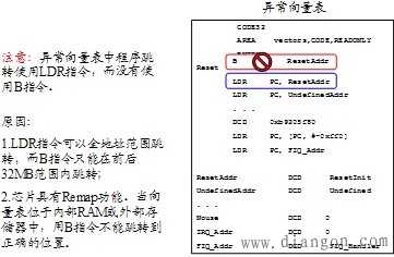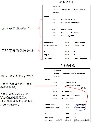 位于启动代码中的异常向量表 什么是启动代码? 一般在32位ARM应用系统中,大多数采用C语言进行软件编程。但是在运行应用代码前需要进行系统初始化。 常用一个汇编文件作启动代码,它可以实现异常向量表定义、堆栈初始化、系统变量初始化、中断系统初始化、I/O初始化、外围部件初始化、地址重映射等操作。