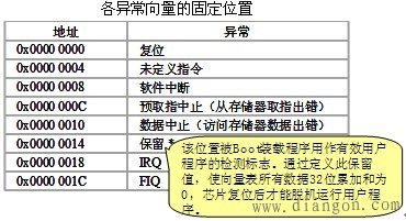 存储器重新映射 存储器重新映射是将复位后用户所见的存储器中部分区域,再次映射到其它的地址上。 对于Philips的LPC系列ARM微控制器,存储器重新映射区域一共为64字节,分别为异常向量区(32字节)和紧随其后的32字节。存储器重新映射的方法允许在不同模式下处理中断,重新映射的存储器区域在地址0x00000000~0x0000003F处。存储器重新映射的控制见“存储器映射控制”小节。 使用存储器重新映射的原因 (1)使Flash存储器中的FIQ处理程序不必考虑因为重新映射所导致的存储器边界问题 (2)用来处理代码空间中段边界仲裁的SRAM和Boot Block向量的使用大大减少 (3)为超过单字转移指令范围的跳转提供空间来保存常量 预取指中止和数据中止异常 如果试图访问一个保留地址或未分配区域的地址,ARM处理器将产生预取指中止或数据中止异常。
