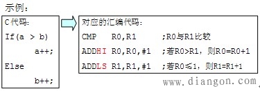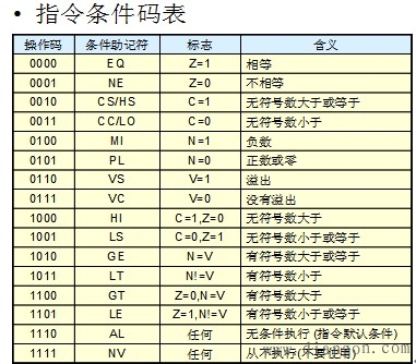 使用条件码“cond”可以实现高效的逻辑操作,提高代码效率。 所有的ARM指令都可以条件执行,而Thumb指令只有B(跳转)指令具有条件执行 功能。如果指令不标明条件代码,将默认为无条件(AL)执行。
