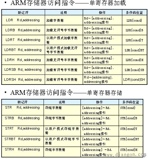 关于“ARM指令集――存储器访问指令”:ARM处理器是典型的RISC处理器,对存储器的访问只能使用加载和存储指令实现。ARM处理器是冯・诺依曼存储结构,程序空间、RAM空间及I/O映射空间统一编址,除对RAM操作以外,对外围IO、程序数据的访问均要通过加载/存储指令进行。 存储器访问指令分为“单寄存器操作指令”和“多寄存器操作指令”。