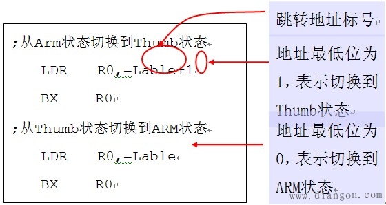 使用BX指令将ARM7TDMI内核的操作状态在ARM状态和Thumb状态之间进行切换,程序如下所示。