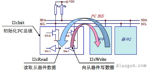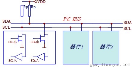 I2C 总线通过2根线――串行数据线(SDA)和串行时钟线(SCL)――连接到总线上的任何一个器件,每个器件都应有一个唯一的地址,而且都可以作为一个发送器或接收器。此外,器件在执行数据传输时也可以被看作是主机或从机。