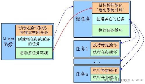 移植μC/OS-II是为了在自己的系统使用μC/OS-II。要在自己的系统中使用μC/OS-II编写自己的应用程序就必须遵守μC/OS-II的编程规范。主要包括主函数和用户任务,它们的关系如下。