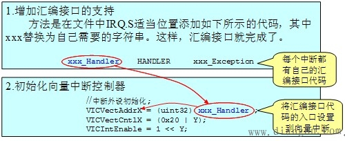 编写中断服务程序代码比较简单,按照7.3.6小节,编写C语言处理函数即可。关键在于把程序与芯片的相关中断源挂接,使芯片在产生相应的中断后会调用相应的处理程序。 这需要做以下两个方面的工作: