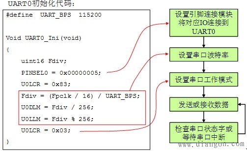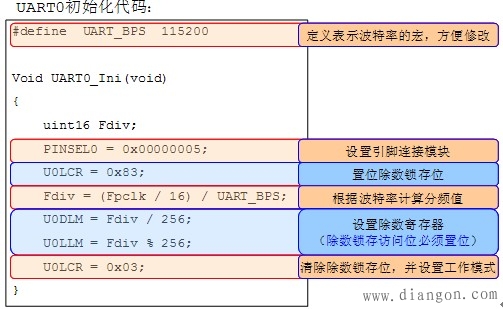 波特率计算公式:U0DLM、U0DLL = FPCLK/(16×baud);