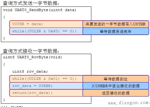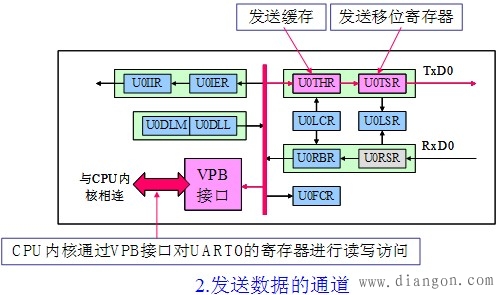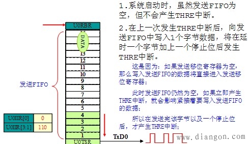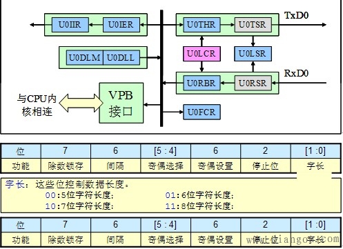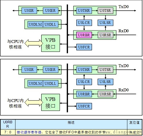 U0RBR与U0THR在同一地址上,但实际上是两个独立的寄存器,读操作时选择U0RBR,写操作时选择U0THR;