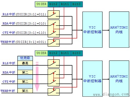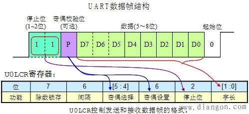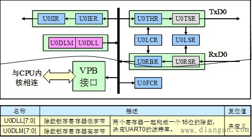 U0DLL与U0RBR/U0THR、U0DLM与U0IER在同一地址上,通过除数访问位DLAB选择。当该位为1时,选择U0DLL和U0DLM。为0时,选择U0RBR/U0THR和U0IER;