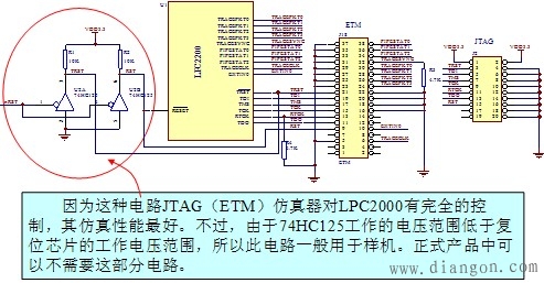 在该电路中,复位电路与前面介绍电路有所不同。它在复位信号和CPU之间插入了三态门74HC125。使用三态门主要是为了复位芯片和JTAG(ETM)仿真器都可以复位芯片。如果没有74HC125,当复位芯片输出高电平时,JTAG(ETM)仿真器就不可能把它拉低,这不但不能实现需要的功能,还可能损坏复位芯片或JTAG(ETM)仿真器。 |