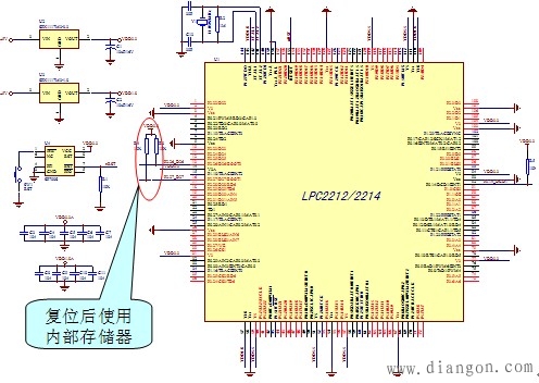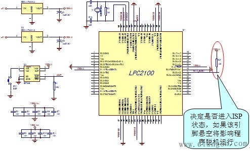 完整的最小系统 LPC2000系列微控制器具有4种类型的最小系统。 LPC2100系列没有外部总线接口的最小系统; LPC2130系列没有外部总线接口的最小系统; LPC2200系列使用外部存储器的最小系统; LPC2200系列使用内部存储器的最小系统。 完整的最小系统 ――LPC2100系列