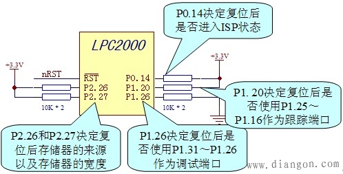 微控制器在复位后可能有多种初始状态,具体复位到哪种初始状态是在复位的过程中决定的。复位逻辑可能通过片内只读存储器中的数据决定具体的初始状态,但更多的是通过复位期间的引脚状态决定,也可能通过两者共同决定。用引脚状态配置复位后的初始状态没有统一的方法,需要根据相关芯片的手册决定。 |