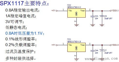 对于LPC2200系列微控制器,它有4组电源输入。理想情况下需要提供4组独立的电源,它们需要单点接地或大面积接地。甚至还有为系统中其它的部件提供更多种类的电源。但如果没有使用LPC2000内部的AD功能,或对AD的要求不高,模拟电源和数字电源可以不分开供电。这样LPC2200和LPC210x都只需要两组电源。 2.设计末级电源电路 LPC2000系列微控制1.8V消耗电流的极限值为70mA。为了保证可靠性并为以后升级留下余量,则电源系统1.8V能够提供的电流应当大于300mA。 整个系统在3.3V上消耗的电流与外部条件有很大的关系,这里假设电流不超过200mA,这样,电源系统3.3V能够提供600mA电流即可。 分析得到以下参数: 3.3V电源设计最大电流:600mA; 1.8V电源设计最大电流:300mA。 在了解功率消耗之后,需要选择合适的器件。 因为系统对这两组电压的要求比较高,且其功耗不是很大,所以不适合用开关电源,应当用 低压差模拟电源(LDO)。合乎技术参数的LDO芯片很多,Sipex 半导体SPX1117是一个较好的选择,它的性价比较好,且有一些产品可以与它直接替换,减少采购风险。