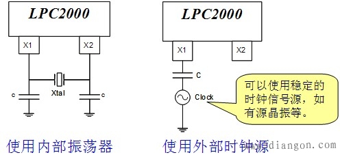 ――时钟 目前所有的微控制器均为时序电路,需要一个时钟信号才能工作,大多数微控制器具有晶体振荡器。简单的方法是利用微控制器内部的晶体振荡器,但有些场合(如减少功耗、需要严格同步等情况)需要使用外部振荡源提供时钟信号。