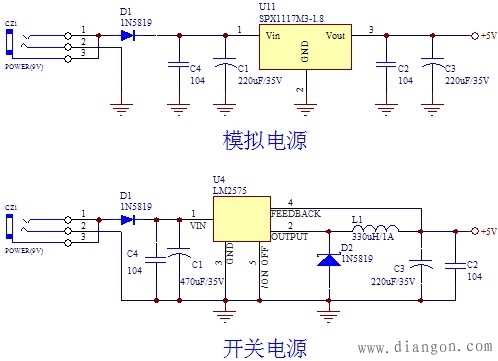 3.设计前级电源电路 尽管SPX1117允许的输入电压可达20V(参考芯片数据手册),但太高的电压使芯片的发热量上升,散热系统不好设计,同时影响芯片的性能。这样,就需要前级电路调整一下。如果系统可能使用多种电源(如交流电和电池),各种电源的电压输出不一样,就更需要前级调整以适应末级的输入。通过之前的分析,前级的输出选择为5V。选择5V作为前级的输出有两个原因: 这个电压满足SPX1117的要求; 目前很多器件还是需要5V供电的,这个5V可以兼做前级和末级了。 根据系统在5V上消耗的电流和体积、成本等方面的考虑,前级电路可以使用开关电源,也可以使用模拟电源。 它们的特别如下: 开关电源:效率较高,可以减少发热量,因而在功率较大时可以减小电源模块的体积; 模拟电源:电路简单,输出电压纹波较小,并且干扰较开关电源小得多。