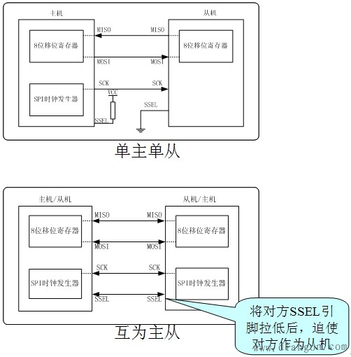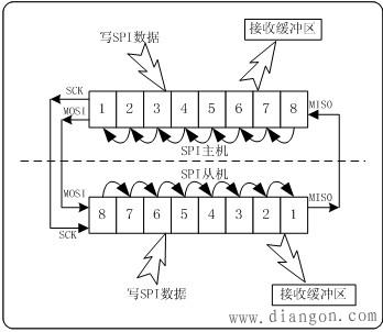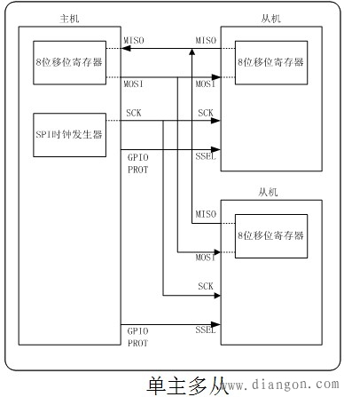 ――总线连接 SPI总线可在软件的控制下构成各种简单的或复杂的系统,如:1个主MCU和几个从MCU;几个从MCU相互连接构成多主机系统(分布式系统);1个主MCU和1个或几个从I/O设备。 大多数应用场合中,使用1个MCU作为主机,它控制数据向1个或几个从外围器件的传送。从器件只能在主机发命令时才能接收或向主机传送数据。其数据的传输格式通常是高位(MSB)在前,低位(LSB)在后,在一些增强型的MCU中高位在前或低位在前都是可通过软件设置的,如LPC2000系列微控制器。