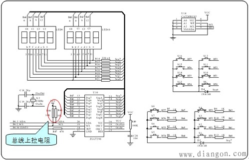 CAT24WC02的I2C总线地址的高4位固定为1010,低四位由A2、A1和A0决定。当A2A1A0引脚悬空时,默认值为000。 ――I2C应用示例 LPC2000系列微控制器都提供了硬件I2C总线接口和I2C总线控制器。由于LPC2000微控制器的SDA和SCL端口为开漏输出,所以必须在SDA和SCL线上分别外接一个上拉电阻。 该示例利用LPC2000微控制器作为I2C总线的主机,在总线上挂接着两个I2C器件作为从机,分别为E2PROM器件CAT24WC02和键盘和LED驱动器ZLG7290。R46和R48即为I2C总线上的两个上拉电阻。
