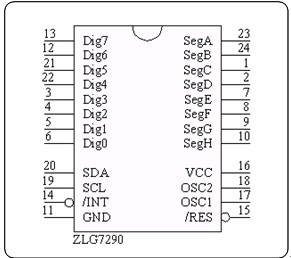 ――ZLG7290 ZLG7290为键盘和LED驱动器,它提供了I2C串行接口和键盘中断信号,方便与处理器连接;可驱动8位共阴数码管或64只独立LED和64个按键, 可控扫描位数以及可控任一数码管闪烁,提供数据译码和循环移位、段寻址等控制,8个功能键可检测任一键的连击次数,无需外接元件即可直接驱动LED即可扩展驱动电流和驱动电压。下图为ZLG7290的引脚排列。