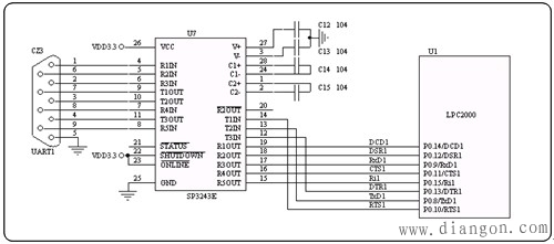 LPC2000系列ARM7微控制器的UART1带有完整的调制解调器(MODEM)接口,只要使用SP3243ECA转换芯片将信号转换成RS232电平,即可与MODEM连接,控制MODEM拔号、通讯等等。