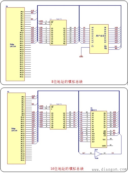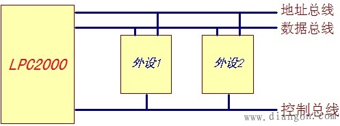 GPIO外设接口设计 ――模拟总线 LPC2000系列部分芯片没有外部总线,当它们需要外接总线设备时就必须用GPIO模拟总线了。因为总线需要大量的信号线,而LPC2000的GPIO资源是宝贵的,所以模拟总线的设计的首要任务是节省GPIO的使用量,这就需要地址、数据总线复用了。