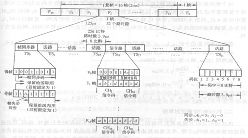 话音信号根据CCITT建议采用8KHz抽样,抽样周期为125s,在125s时间内各路抽样值所编成的PCM信码顺序传送一次,这些PCM信息码所对应的各个数字时隙有次序的组合称为一帧,显然,PCM帧周期就是125s。 在帧中除了要传送各路PCM信码以外,还要传送帧同步码以及信令码。,一帧码流中含有帧同步码、复帧同步码、各路信息码、信令码以及告警码等。 下图为PCM30/32路系统帧结构图。图 下面对帧结构分别进行说明。 1. 30个话路时隙:TS1~TS15,TS17~TS31 2. 帧同步时隙:TS0 在不同帧的TS0位置所传送的信息是不一样,分为偶帧和奇帧的情况。 偶帧TS0:发送帧同步码0011011;偶帧TS0中的8位码中第一位码保留给国际用,暂定为1,后7位为帧同步码。 奇帧TS0:发送帧失步告警码。 奇帧TS0的8位码中的第一位也保留给国际用,暂定为1。其第二位码固定为1码,以便在接收端用以区别是偶帧还是奇帧。第三位码A1为帧失步时向对方发送的告警码,简称对告码。 当帧同步时,A1为0;当帧失步时A1为1,以便告诉对端,收端已经出现失步,无法工作。其第4~8位码可供传送其它信息,如业务联络等。这几位码未使用时,固定为1码。这样,奇帧TS0时隙的码型为{11A111111}。 3. 信令与复帧同步时隙:TS16