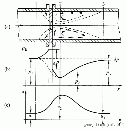 一定的情况下,节流元件前后压力差的大小与流量有关。因此,可以通过测量节流元件前后的差压来测量流量。流体流经节流元件时的压力、速度变化情况如图2所示。从图中可见,稳定流动的流体沿水平管道流动到节流件前截面l之后,流束开始收缩,位于边缘处的流体向中心加速,流束中央的压力开始下降。由于流动有惯性,流束收缩到最小截面的位置不在节流件处,而在节流件后的截面2处(此位置随流量大小而变),此处的流速u2最大,压力P2最低。过截面2 后,流束逐渐扩大。在截面3处,流束充满管道,流体速度恢复到节流前的速度(u1= u3)。由于流体流经节流件时会产生漩涡及沿程的摩擦阻力等造成能量损失,因此压力P3不能恢复到原来的数值P1。P1与P3的差值δp称为流体流经节流件的压力损失。