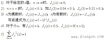 阶第一类贝塞尔函数   变化的曲线 图4.5.5 第一类贝塞尔函数曲线   贝塞尔函数的主要性质如下:   在此基础上,将 展开为傅里叶级数有   利用贝塞尔函数的性质和两个表达式,整理得宽带调频信号的时域表示式   说明:单音调制的宽带调频信号由一系列幅度不同、频率不同的余弦信号相加构成,含有无穷多个频率分量。