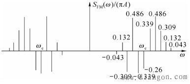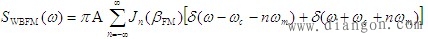 说明:单音调制的宽带调频信号由一系列幅度不同、频率不同的余弦信号相加构成,含有无穷多个频率分量。 2.单音调制的WBFM信号的频谱 对上式求傅立叶变换,得到宽带调频信号的频谱 |