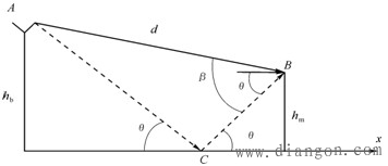 图1表示有一条直射波和一条反射波路径的两径传播模型。图1中,A表示发射天线;B表示接收天线;hb和hm分别表示发射天线和接收天线离地面的高度;AB表示直射波路径;ACB表示反射波路径。 在接收天线B处的接收信号功率表示为 |