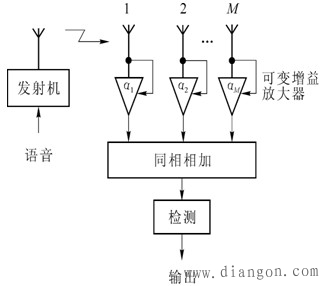 M个分集支路经过相位调整后,按适当的增益系数同相相加(检测前合并),再送入检测器,如图3所示。