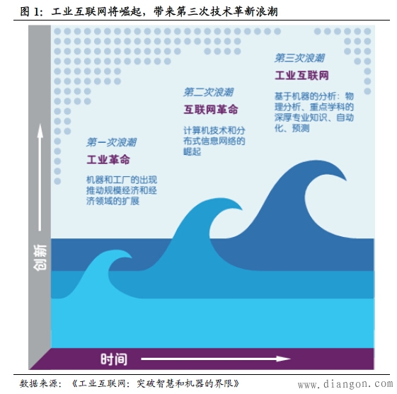 在我国当前阶段,工业互联网具体表现为将互联网作为当前信息化的核心,推动移动互联网、云计算、大数据、物联网等与现代制造业结合,推动两化融合深度发展。我们认为,工业互联网是2015年政府工作报告中提出的互联网+行动计划的关键部分,即互联网+工业。而中国制造2025?也为后续产业升级指明了方向。在人类的发展史上,经历了两次技术的飞跃,分别是工业革命、计算机与互联网革命,我们认为,第三次技术的飞跃将是工业互联网革命。