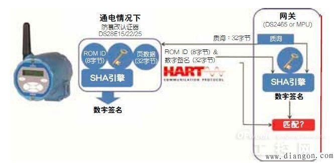 图1所示的简化概念方框图为采用对称SHA256算法的硬件安全认证方案。SHA-256协议基于安全认证器件之间的质询-应答交换,在接收和读取传感器数据之前,对传感器进行安全认证。SHA-256安全认证使攻击者不能连接至网络来冒充传感器甚至利用受损系统代替传感器系统。