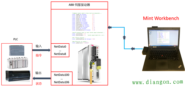 在驱动器内下载ABB标准的GDI程序。标准GDI程序为伺服驱动器定义了一系列输入和输出寄存器(NetData)。上位plc可通过对NetData的读写,实现对ABB伺服的控制。